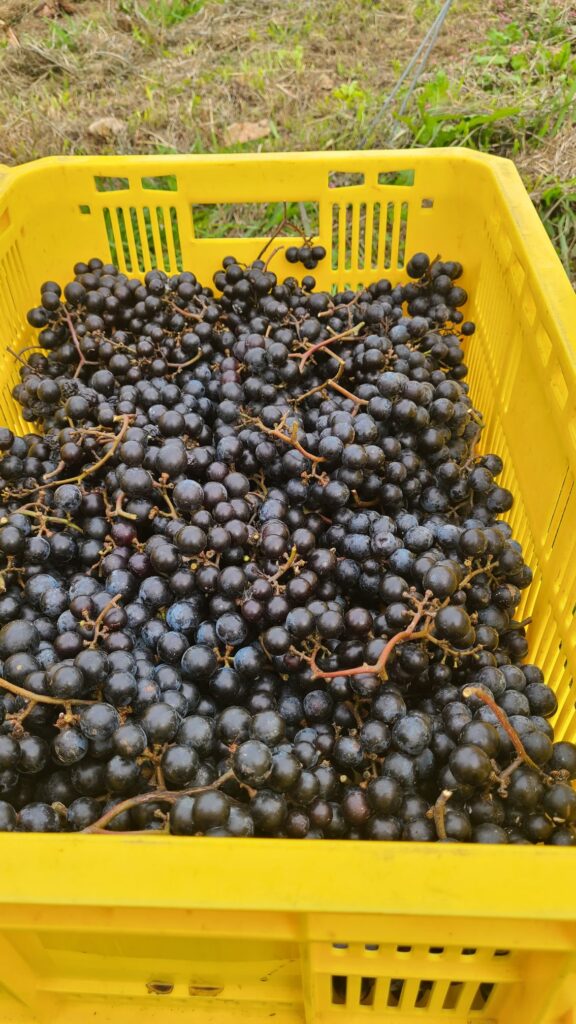 2025年10月31日 正式名称は【マスカットベーリーA】 岩﨑元気さんの遅摘みブドウの収穫を体験させてもらいました(^3^)/ 完熟したこの色味! 糖度も酸度もあるということで、楽しみですね。 野菜も果樹も本当に面白いなぁ~!